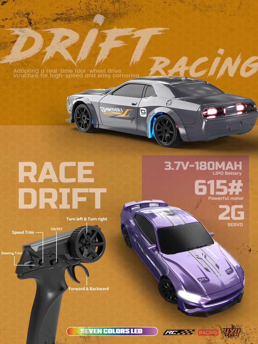 Half Scale: The throttle is proportionally controlled, and the steering has only one fixed angle